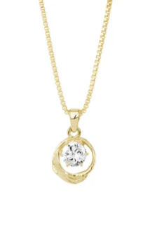 Hálsmenið er handsmíðað hálsmen úr 14 karta gulli með cubic zirconia steini. Menið er um 10 mm á hæð.