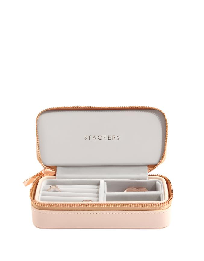 Stackers ferðaskríninn koma í þremur mismunadi stærðum, öll eru þau kædd að innan með flaueli og að utan með sterku leðurlíki. Við eigum þau til þremur mismunadi litum Svörtu, Bleiku og Gráu