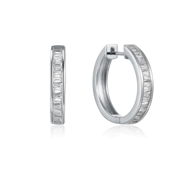 Glæsilegir hring eyrnalokkar úr rhodium húðuðu silfri með glærum baguette-skornum sirkon steinum.